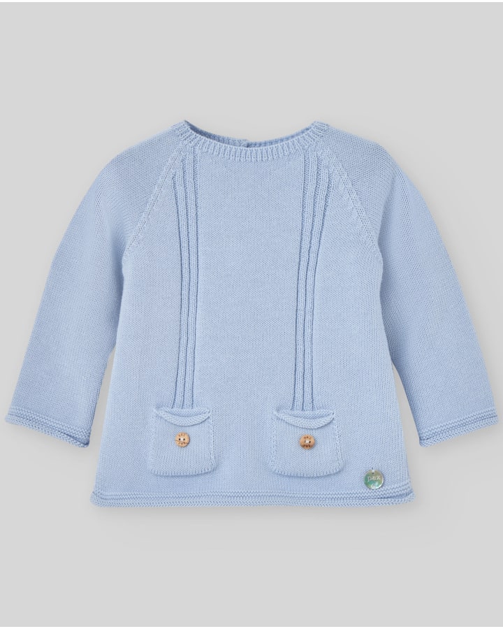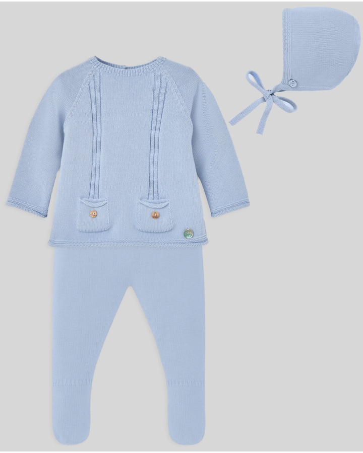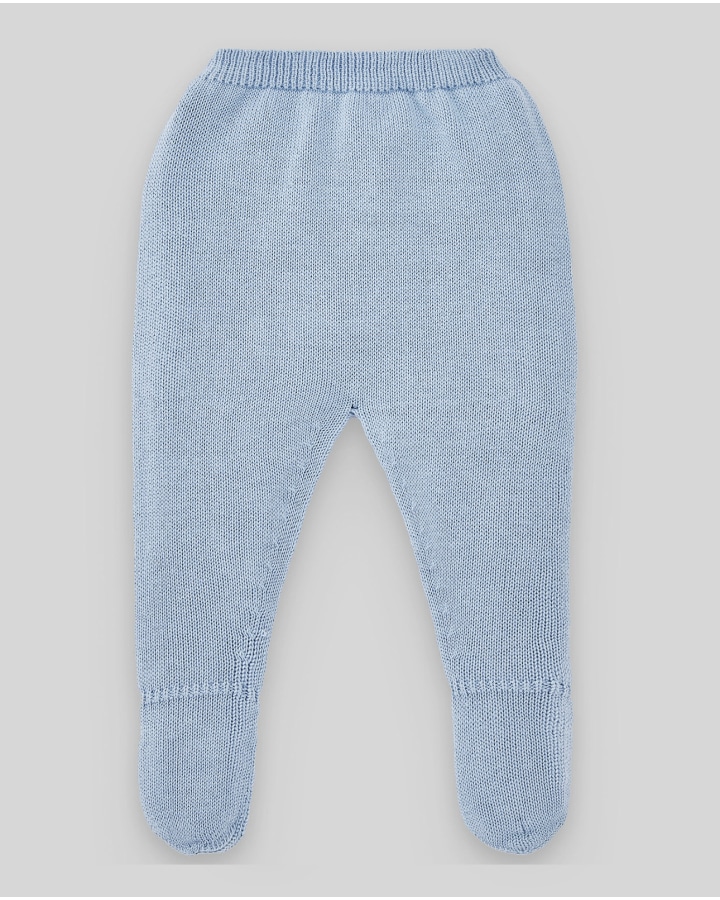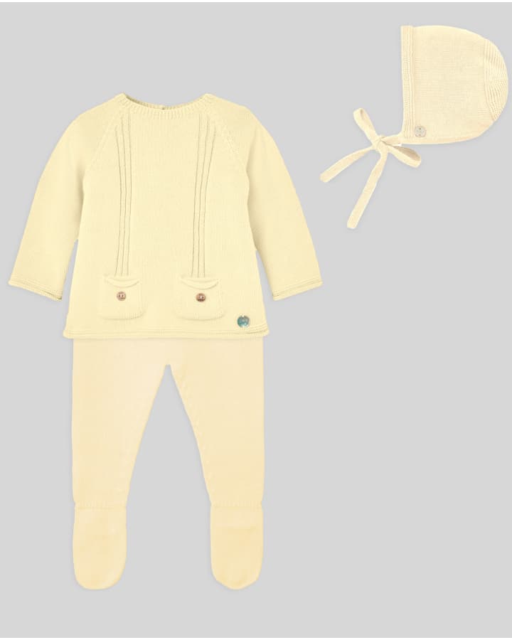 Conjunto de bebé formado por jubón de punto y polaina, confeccionados en algodón suave con delicados calados. Ideal para los primeros meses del recién nacido, ofreciendo comodidad y dulzura.