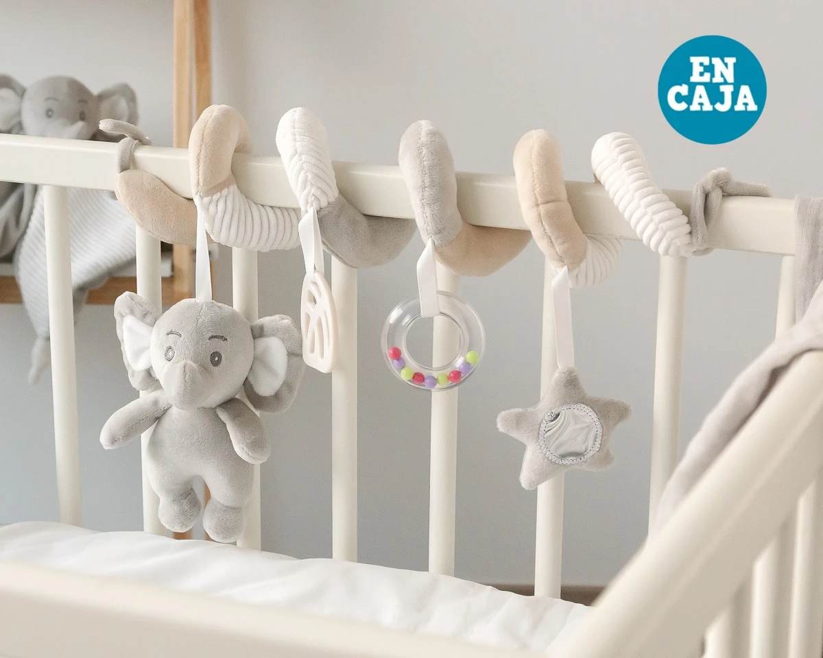 Con nuestro elefante de peluche con forma de espiral, tu peque se sentirá acompañado desde la cuna y entretenido en la silleta, ya que es ideal para ponerlo en la barra delantera, y que el bebé juegue con él durante su paseo diario. También se puede colocar en la baranda de la cuna o utilizarlo como un peluche más de su colección. Un peluche del que no querrá separarse cuando salga de paseo o se vaya a dormir.