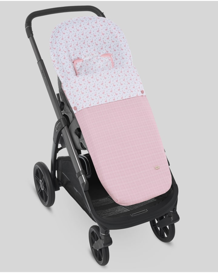 Saco para sillas de paseo confeccionado en otoman de cuadros combinado con otoman gansos en el interior. Cremalleras laterales para convertir el saco en colchoneta. Refuerzo de polipiel en los pies. Relleno del cubrepiés extraible.